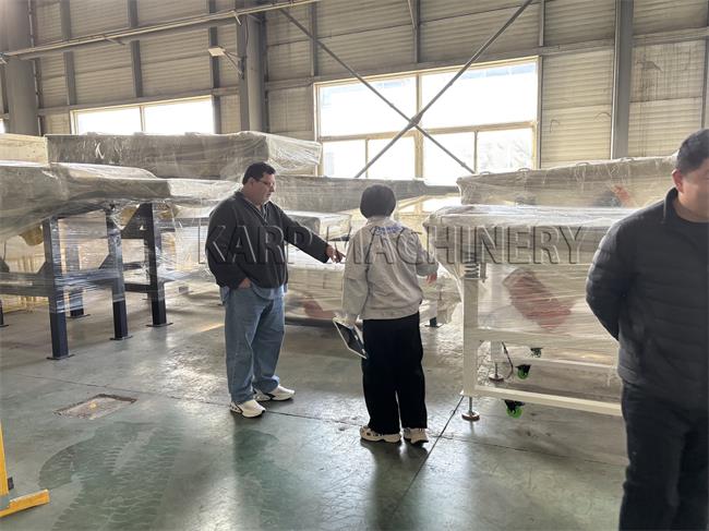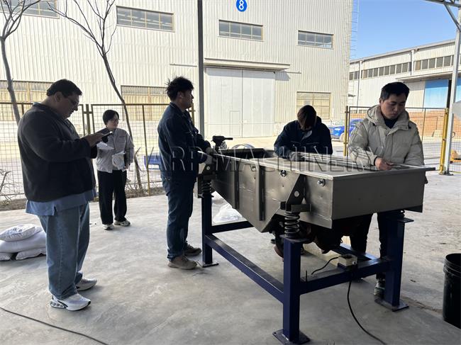 The customer also visited our workshop to watch a live machine test. We used material with similar characteristics to demonstrate actual performance. The linear vibrating screen showed stable operation, good separation accuracy, and a clear improvement compared with manual screening.